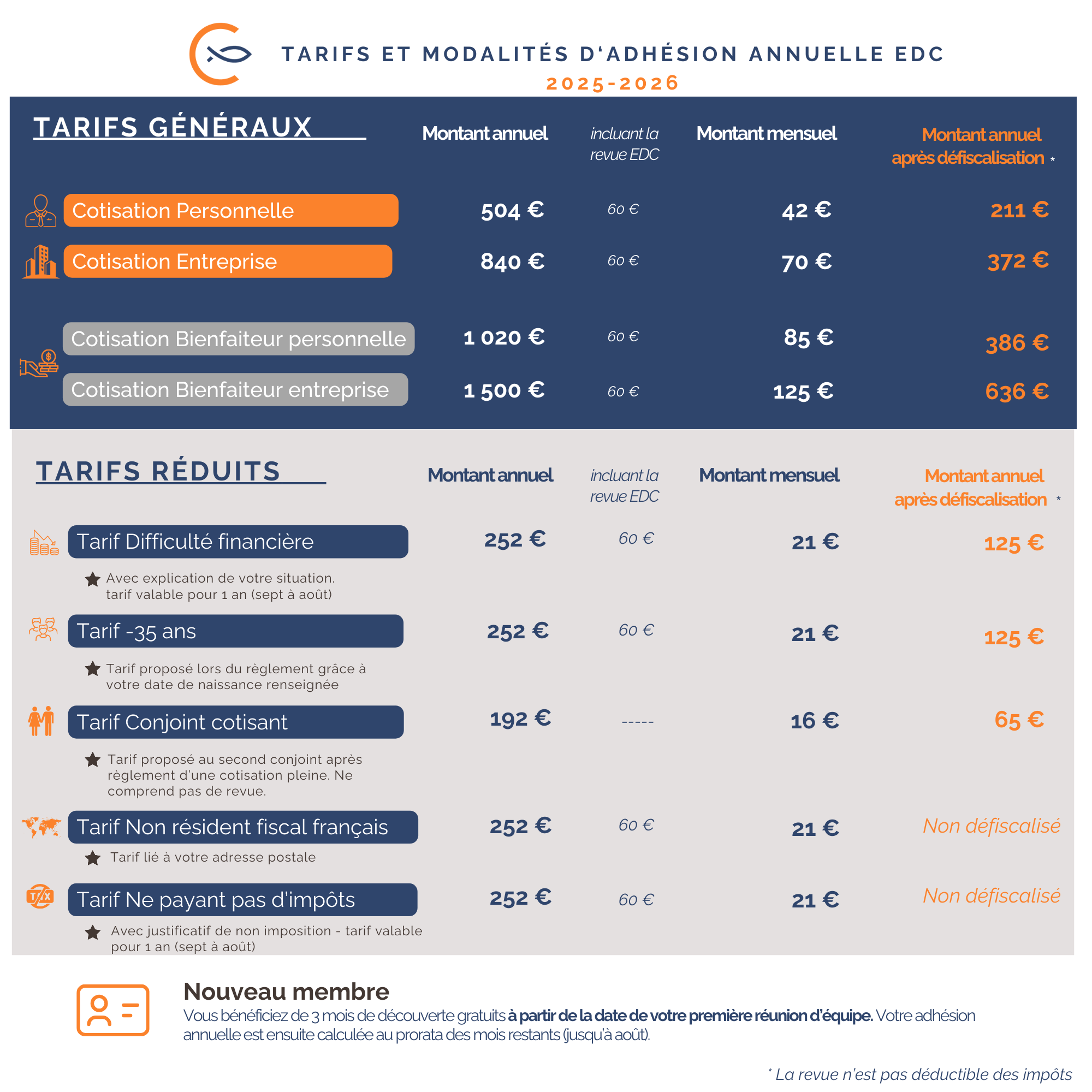 Ce montant comprend la cotisation et l’abonnement à la revue des EDC Dirigeants Chrétiens d’une valeur annuelle de 60€ (véritable support d’information, d’approfondissement et d’échanges pour un membre). Il est toutefois possible d’adhérer sans cet abonnement.