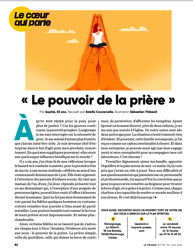 Dans un article du PELERIN du 25 Juin 2020, Sophie Soury témoigne de l’importance de la prière comme outil pour se donner du courage dans sa journée, en confiant sa journée au Seigneur.